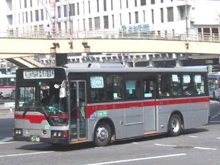 東急バス一般塗装。東急電車と同じイメージの、銀色に赤帯。 |